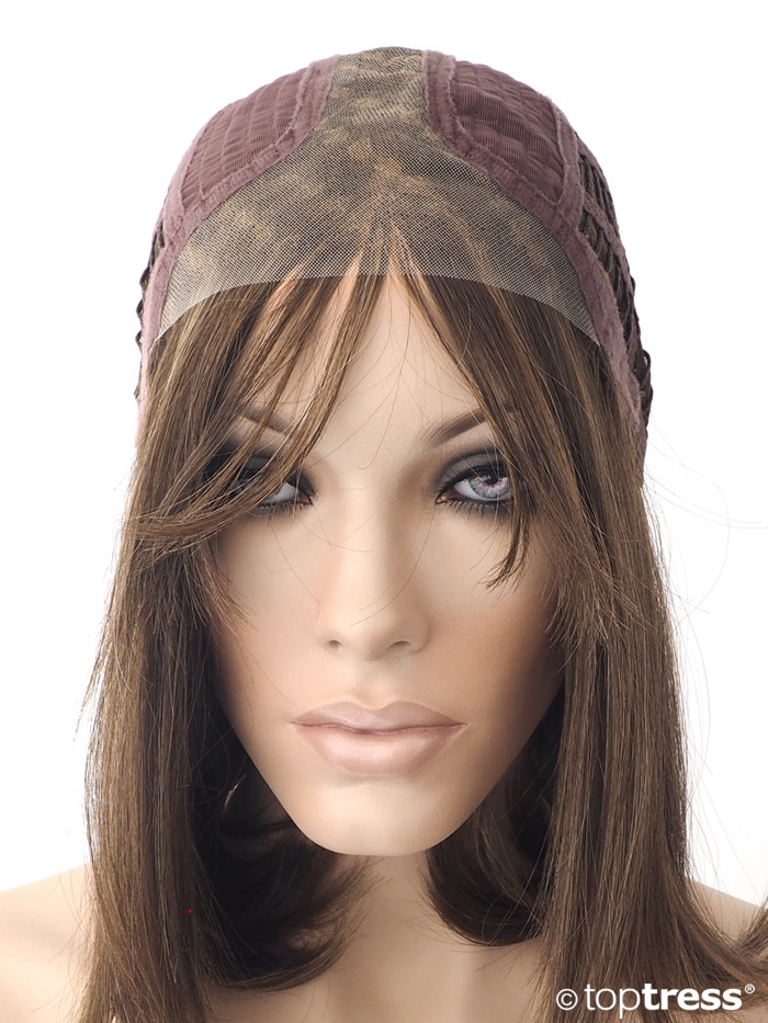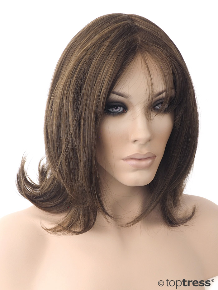 Perücke Dolores mittelbraun, braun, hellbraun, schulterlange Thermosilk Perücke mit Stufenschnitt, Filmansatz und Filmscheitel (Lace). Aus hitzebeständigem Kunsthaar