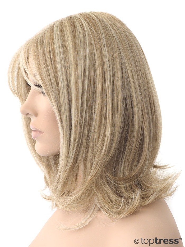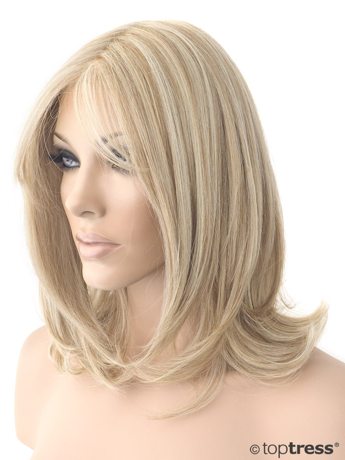 Perücke Dolores schulterlange Thermosilk Vollperücke mit Stufenschnitt, Filmansatz und Filmscheitel (Lace). Aus hitzebeständigem Kunsthaar, blond mit Highlights