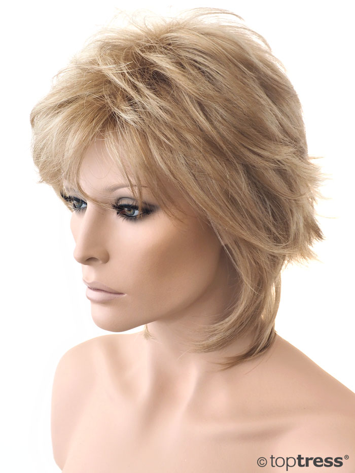Ein federleichtes Volumenwunder. Flippiger, fransiger Kurzhaarschnitt mit langer Nackenpartie, aus hochwertigem Kunsthaar, mit regulierbarer Größe..
